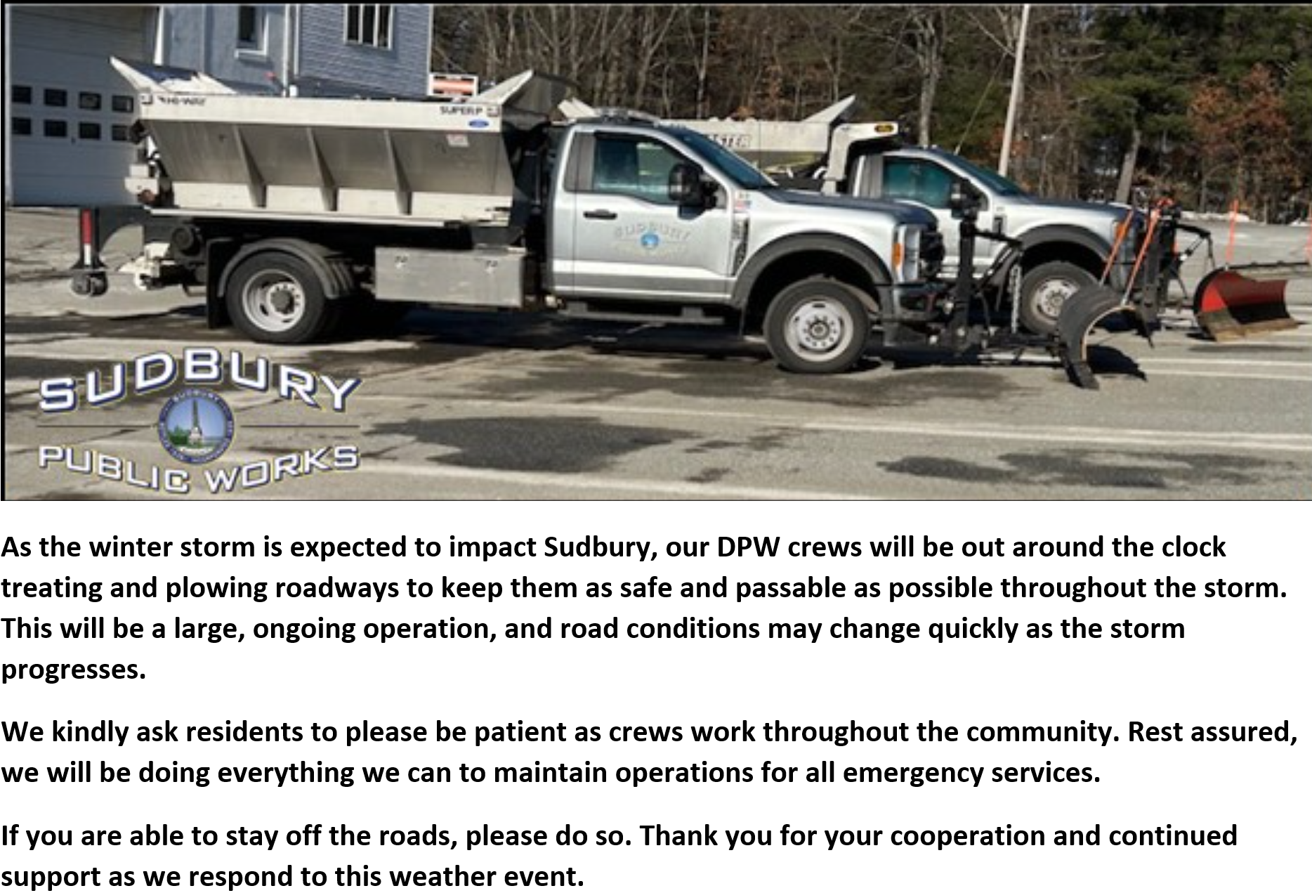 Sudbury Town Offices to work remotely on Monday 1/26/26 due to the storm and road conditions. Read full article