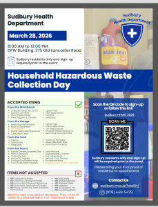 Sudbury is holding it’s annual Household Hazardous Waste Collection Day Event on Saturday March 28th, 2026 from 8:00 AM – 12:00 PM at the Sudbury DPW Building located at 275 Old Lancaster Rd. Sudbury. Click here for more information. Click Here Flyer for 2026 HHHWCD