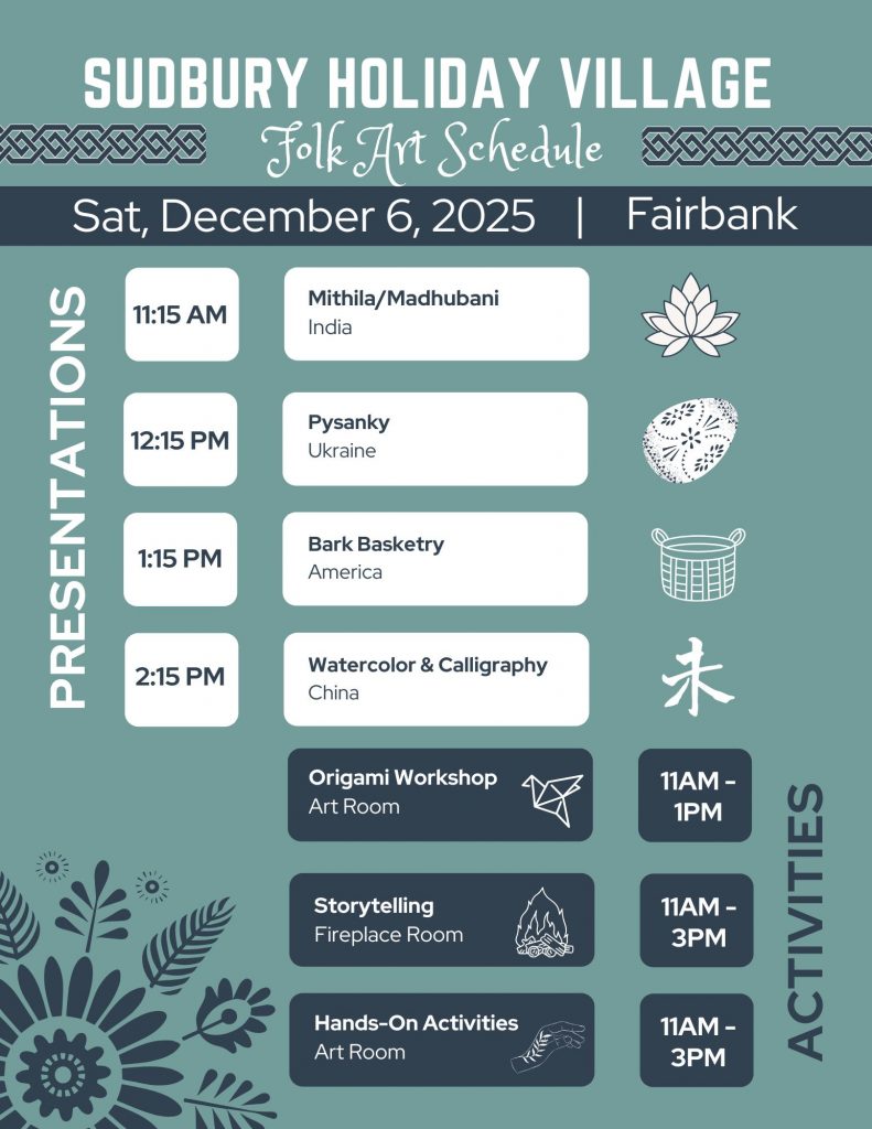 | Notes: | Saturday, December 6, 2025 11AM to 3PM at Fairbank Community Center Folk Gifting Traditions - The Art of the Holidays |
