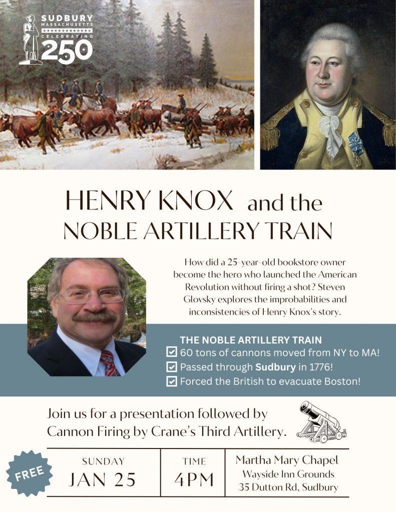 How did a 25-year-old bookstore owner become the hero who launched the American Revolution without firing a shot? Local writer Steven Glovsky explores the improbabilities and inconsistencies of Henry Knox’s story, leading up to his undertaking the transport of urgently needed cannon in the winter of 1775 – 1776.