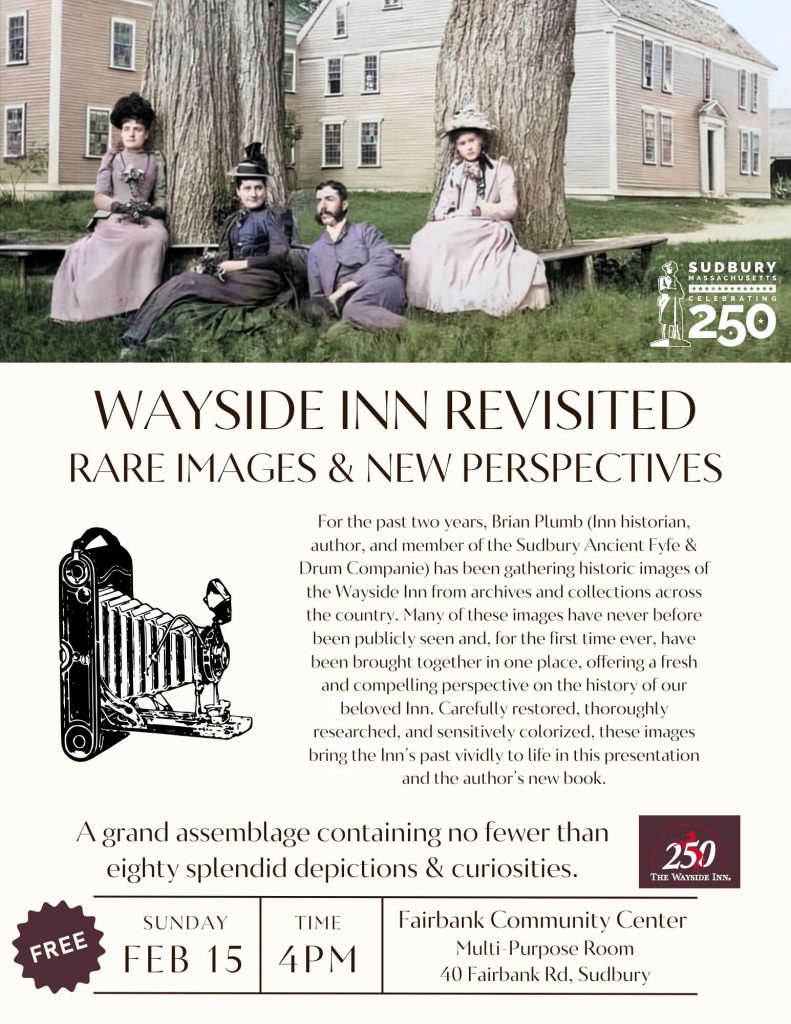For the past two years, Brian Plumb (Inn historian, author, and member of the Sudbury Ancient Fyfe & Drum Companie) has been gathering historic images of the Wayside Inn from archives and collections across the country. Many of these images have never before been publicly seen and, for the first time ever, have been brought together in one place, offering a fresh and compelling perspective on the history of our beloved Inn. Carefully restored, thoroughly researched, and sensitively colorized, these images bring the Inn’s past vividly to life in this presentation and the author’s new book.